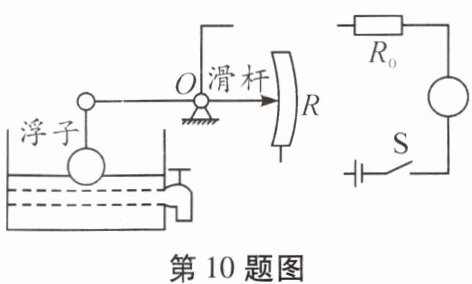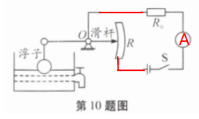 10. 如图所示是一种测定油箱内油量的装置。其中R是滑动变阻器的电阻片,滑动变阻器的滑片跟滑杆连接,滑杆可以绕固定轴O转动,另一端固定着一个浮子。油箱中的油量越多,由电表改成的油量表示数越大,请从“电流表A”或“电压表V”中选择恰当的电表填入圆圈内(仅填符号“A”或“V”)并完成电路连接。