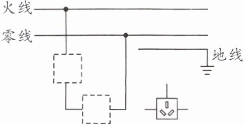 图略(开关$S$接在虚线框内靠近火线处,电灯$L$接在开关之后;三孔插座左孔接零线,右孔接火线,上孔接地线)
