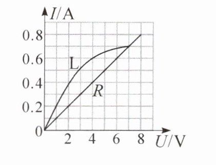 3. L与R串联在6V电源上,电流相等,总电压为6V。由图像可知,当I=0.4A时,$U_{R}=4V$,$U_{L}=2V$,满足$U_{R}+U_{L}=6V$。总功率$P_{总}=UI=6V×0.4A=2.4W$。