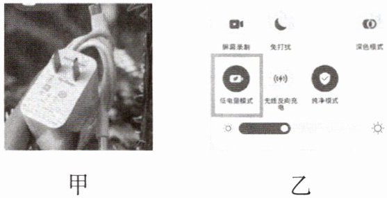 2. 智能手机在现代生活中的作用越来越重要。如图所示,图甲是某手机的“超级快充”插头,图乙是手机功能显示,其中有“低电量模式”,能延长手机的使用时间。关于“超级快充”和“低电量模式”,下列说法中正确的是(