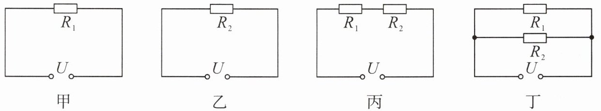 丁图中 $R_1$ 和 $R_2$ 并联,总电阻为 $\frac{R_1R_2}{R_1 + R_2}$。