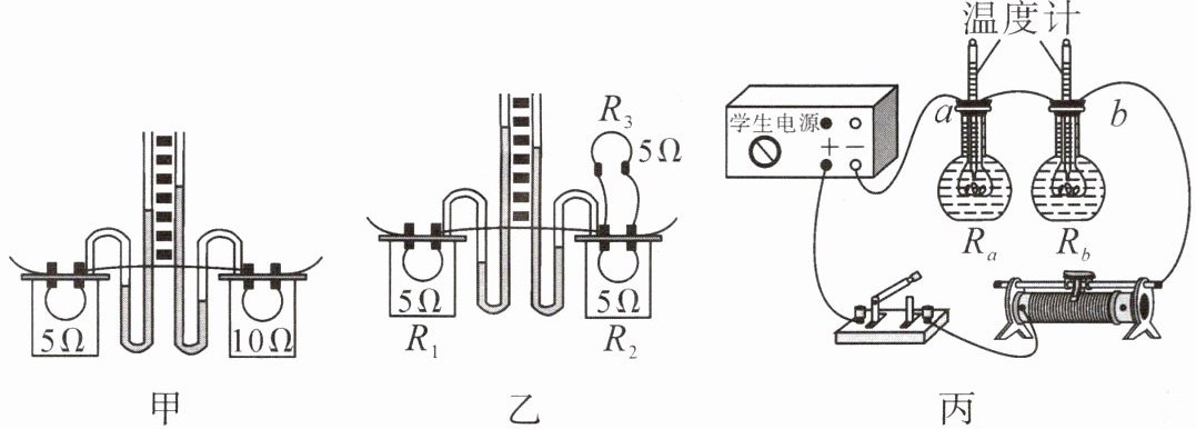 大小不同。(4)利用图丙装置探究液体吸热能力的大小时,在a、b两瓶内装入质量、初温都相同的不同液体,且$R_{a}= R_{b}$。通电一段时间后,观察到b瓶内液体温度高一些,可判断b瓶内液体的吸热能力较