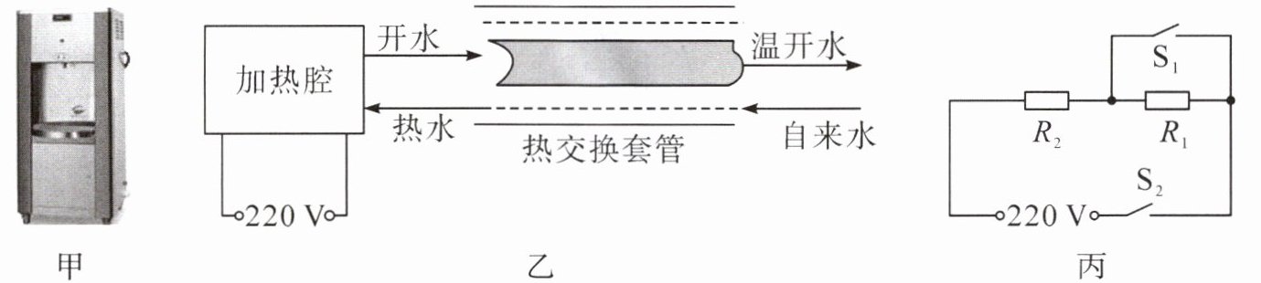即热式节能饮水机已在地铁站、学校、宾馆等公共场所广泛使用,如图甲所示为某品牌即热式节能饮水机,其原理如图乙所示。烧开的水很烫,不能立即饮用,即热式节能饮水机中的热交换套管很好地解决了这一问题,它的奥秘在于将进水管与出水管贴在一起,利用水管中的冷水给出水管中的开水降温,同时,进水管中的冷水被预热后送到加热腔中用电热器烧开。若当节能饮水机的出水流量为2.0 L/min时,20 ℃的自来水经热交换套管后被预热成60 ℃的热水流进加热腔,同时有相同质量的100 ℃的开水从加热腔流进热交换套管变成可供直接饮用的温开水流出。即热式节能饮水机喝水无须等待,即按即出,而且具有待机零功耗的优点,比传统饮水机更节能、省电,真正倡导了绿色环保饮水新概念。
