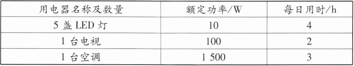 | 用电器名称及数量 | 额定功率/W | 每日用时/h |