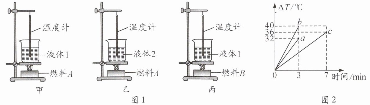 5. 小丽利用如图1所示的甲、乙和丙三套装置完成热学实验,液体1和2的质量相同,燃料A和B的质量也相同。