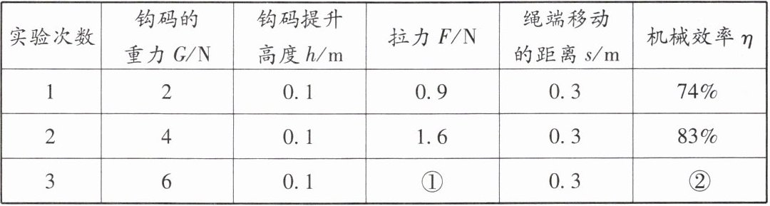 方向匀速提升不同数量的钩码进行实验。观察图中弹簧测力计的示数,表格中编号①的数值是2.3