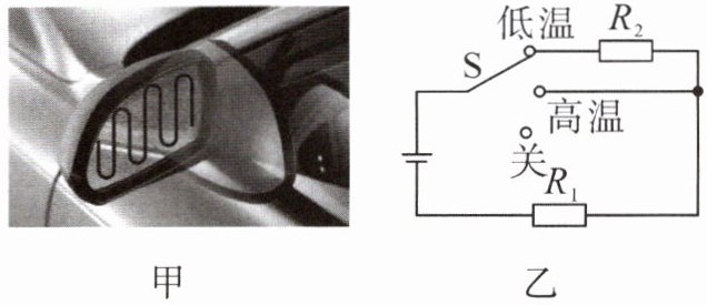 8. 小明家新买了一辆汽车,具有后视镜加热功能,如图甲所示。通过观察和研究,他了解到该功能有“高温”“低温”和“关”三个挡位,根据气温、雨水情况自动切换,已知$R_1$阻值为16 Ω,“低温”挡功率为24 W。电路简图如图乙所示,电源电压为24 V,S为挡位切换开关。$R_1$和$R_2$为电热丝。求: