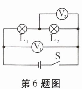 6. 如图所示的电路中$,L_1$标有$“6 V 3 W”,L_2$标有“3 V 3 W”,闭合开关后,两灯均发光,两电压表示数之比$U_1:U_2= $