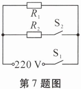7. 某电热水器的额定电压为220 V,有高温和低温两个挡位。低温挡的电功率为550 W。其内部电路由发热电阻$R_1$和$R_2$组成$,R_1= 2R_2,$简化电路如图所示。开关$S_1$闭合$,S_2$断开时,电热水器处于______挡$,R_1$的电阻为______Ω,高温挡的电功率为______W。