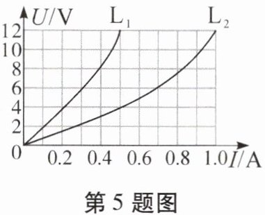 5. 有两只灯泡$,L_1$标有“12 V 6 W”、$L_2$标有“12 V 12 W”的字样,通过它们的电流随两端电压的变化关系如图所示。若将两灯并联接在12 V电源两端,则