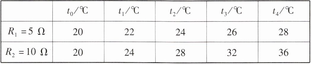 (2)闭合开关,通电后,每经过1 min就读出两支温度计的示数,并将数据填写在表中。