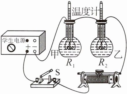 【实验器材】电阻丝的电阻$R_{1}= 5\ \Omega$、$R_{2}= 10\ \Omega$,温度计、滑动变阻器、电源、开关、导线若干、煤油、烧瓶、秒表。