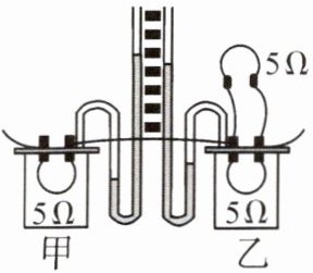 第一空:由图可知,甲、乙两容器中的电阻丝串联,通过它们的电流和通电时间相同,而甲容器中的电阻丝阻值为$5\Omega$,乙容器中的电阻丝阻值也为$5\Omega$,但甲容器外部并联了一个$5\Omega$的电阻,使得通过甲容器中电阻丝的电流与通过乙容器中电阻丝的电流不同,所以该实验是探究电流通过导体产生的热量与电流的关系。