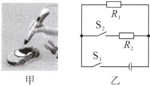 5. (2023·广东)如图甲是用某款3D打印笔进行立体绘画时的场景,打印笔通电后,笔内电阻丝发热使笔内绘画材料熔化;加热电路简化后如图乙所示,电源电压恒为$6 V,R_1$和$R_2$为发热电阻丝,只闭合$S_1$时低温挡工作$,S_1、$$S_2$都闭合时高温挡工作,高温挡和低温挡的功率比为$4∶3,R_1= 4Ω,$忽略电阻丝阻值随温度的变化,求: