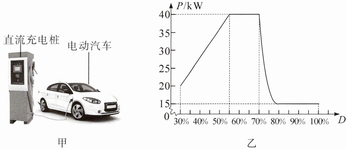 设电池当前储能占充满状态储能的百分比为D。充电时,充电桩的充电功率P会随着电池的D的变化而变化,同时用户还可以通过充电桩显示屏了解充电过程中的其他相关信息。现实际测试一个直流充电桩对某辆电动汽车的充电性能。假定测试中充电桩输出的电能全部转化为电池的储能。充电前,D为30%,充电桩显示屏中充电时长、充电度数、充电费用示数均为0。开始充电后,P与D的关系如图乙所示(为方便计算,图像已作近似处理),充满后,立即停止充电。当D达到70%时充电桩显示屏的部分即时信息如下表。
