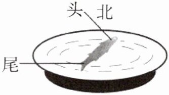 例1【古代科技】据《武经总要》记载,古人将具有磁性的空心铁鱼放入水中漂浮,制成指南鱼,如图所示是指南鱼静止时的指向。下列说法错误的是(