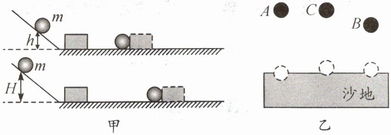(5)如图乙所示,有三个实心的、大小相同的铁球A、铁球B和塑料球C,球A、C离沙地高度相同。现让三个球同时由静止释放,球落到沙地上的状态如图乙中虚线球所示。比较球A、C可得出重力势能大小与