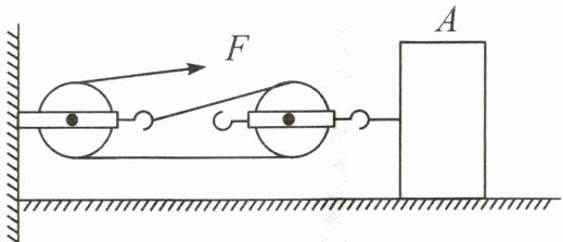 11. 如图所示,小聪用滑轮组拉动水平地面上重为500 N的物体A,使它匀速前进2 m,地面对它的摩擦力为150 N,小聪施加的拉力$F = 100\ N$(忽略绳重和滑轮重),则滑轮组做的有用功为