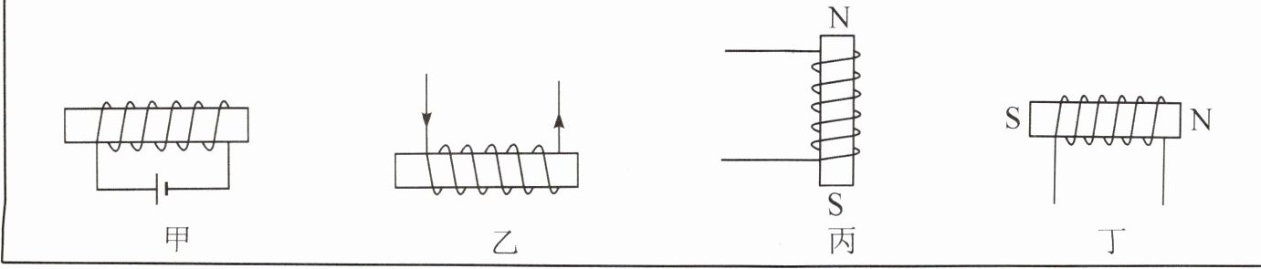 图丁:根据右手螺旋定则反向判断,电流从螺线管的上端流入,下端流出。