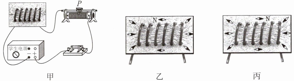 (1)由图甲可以看出通电螺线管外部的磁场和条形磁体的磁场相似,铁屑的作用是显示磁场的分布情况。