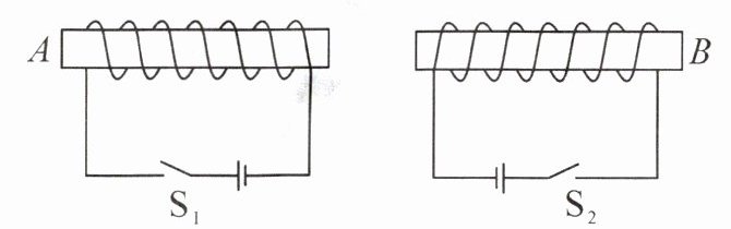 例3 如图所示,闭合开关$S_1、$$S_2,$两个通电螺线管的相互作用情况以及A、B端的极性分别是(