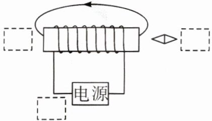 【答案】:从左到右,三个虚线框内依次为:小磁针左端为$S$极,右端为$N$极;通电螺线管左端为$S$极,右端为$N$极;电源左端为正极,右端为负极。图略。