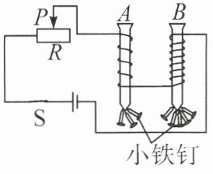 A、B两个电磁铁串联,电流相同,A的线圈匝数比B少,A吸引的大头针比B少,说明当电流一定时,电磁铁的线圈匝数越多,磁性越强。