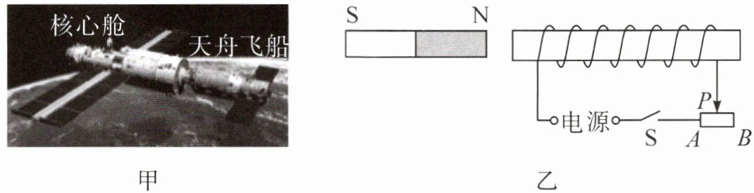 6. 【航空航天】2024年1月18日,天舟七号货运飞船在中国空间站成功对接(图甲)。当货运飞船和核心舱相互靠近时,为减缓撞击带来的影响,货运飞船与核心舱间需配置缓冲装置。“飞天”兴趣小组根据以上信息结合物理知识,设计了如图乙所示的缓冲装置简化图。当条形磁体和通电螺线管靠近时,产生相互排斥的力,说明通电螺线管左端为
