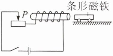 选项C:将滑片$P$向左端移动,滑动变阻器接入电路的电阻变大,根据欧姆定律$I = \frac{U}{R}$(其中$I$为电流,$U$为电压,$R$为电阻),在电源电压不变的情况下,电阻变大,电流变小,电磁铁磁性减弱,小车推出距离变近,该选项错误。