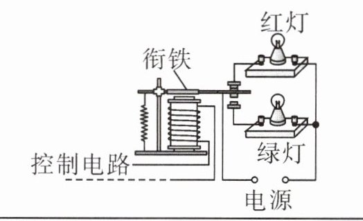 例1:当控制电路接通时,电磁铁有磁性,衔铁被吸下,此时动触点与下方的静触点接触,绿灯所在电路断开,红灯所在电路接通,所以红灯亮。