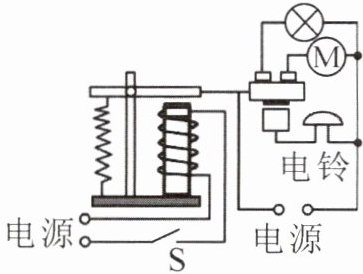 解:当开关S闭合时,控制电路接通,电磁铁有磁性,吸引衔铁向下运动,动触点与下面静触点接触,上面静触点断开。此时灯和电动机所在电路断开,电铃所在电路接通。因此,灯不亮,电动机不转,电铃响。