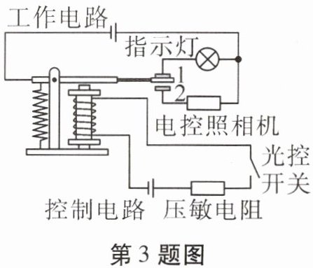 3. 如图所示是一种“闯红灯违规证据模拟器”的工作原理图。当汽车闯红灯时,压敏电阻受到车的压力,其阻值变小,光控开关会接收到红光自动闭合。电控照相机工作,拍摄违规车辆。下列说法错误的是(