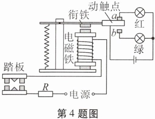 4. 如图所示是兴趣小组同学设计的运动音乐踏板装置,踩下或松开踏板,两音乐灯交替工作。下列描述正确的是(