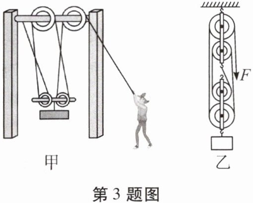 3. 【古代科技】如图所示,图甲是《墨经》中记载的我国古代提升重物的工具——“车梯”,图乙是其等效图。若利用此“车梯”使80 kg的重物在10 s内匀速竖直上升2 m,所用的拉力为300 N,g取10 N/kg。下列说法中错误的是(