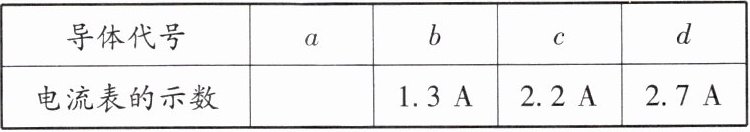 (3)依次用导体$b$、$c$、$d替换导体a$接入电路,闭合开关,电流表对应的示数如下表所示。