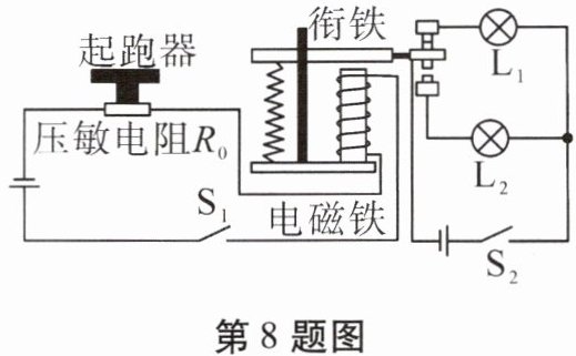 8. 如图所示是小华设计的短跑比赛“抢跑判断器”。运动员蹲在起跑器上后,工作人员闭合开关$S_1、$$S_2,$发令指示灯亮,运动员抢跑后,R₀所受压力变小,电阻变小,电磁铁的磁性