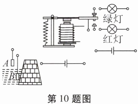 10. 小张同学根据所学知识,利用如图所示的器材,为三防指挥部设计了一个水位自动报警器:当水位尚未达到金属块A所在的高度时,工作电路中绿灯亮,表示水位正常;当水位达到A所在高度时(河水含有杂质,属于导体),红灯亮(发出报警信号)。请按照上述要求将图中的电路连接完整。