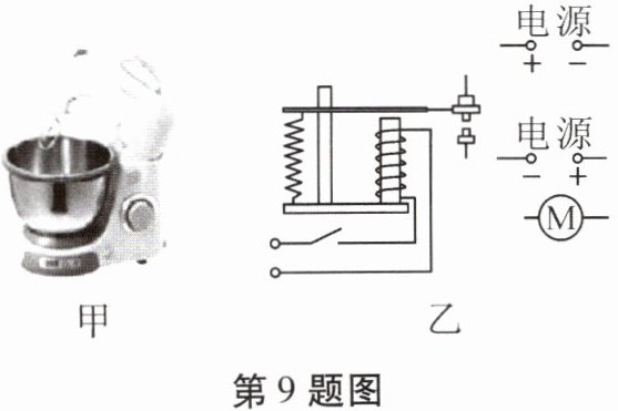9. 如图甲所示是一种双向双动式和面机,工作时搅拌器可以正反搅拌。小明利用如图乙所示电磁继电器控制搅拌器的正、反转,请将工作电路连接完整。
