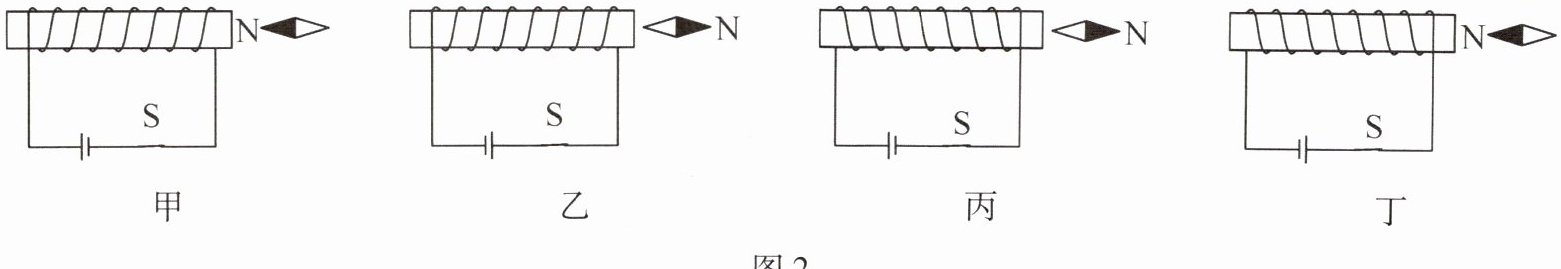 (5)为了研究通电螺线管的磁极性质,同学们一起对螺线管的电流方向和绕线方式进行了实验,得到了如图2所示的四种情况。实验说明通电螺线管的磁极极性只与