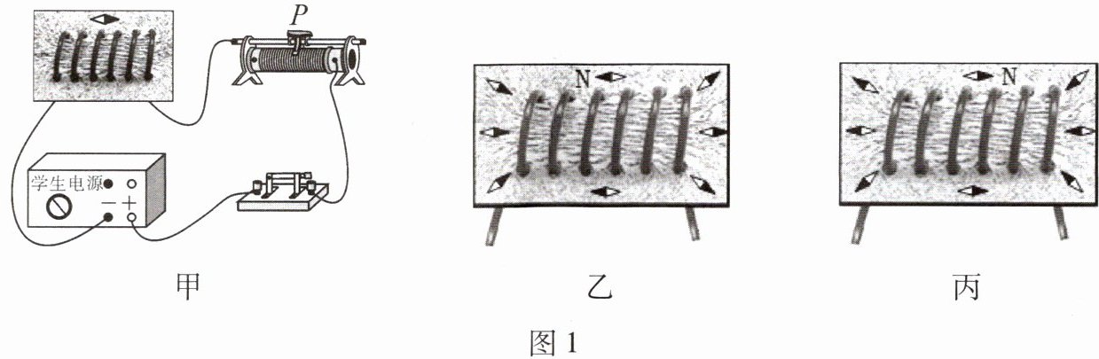 磁体周围铁屑的分布情况相似。(3)把小磁针放在通电螺线管四周不同的位置,小磁针静止时N极所指方向如图1-乙所示,则通电螺线管的右端为