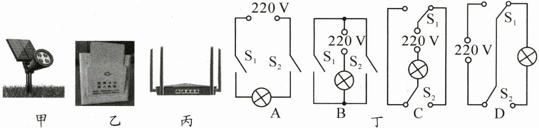 (选填“串联”或“并联”)的。 (3) 小明还发现房门口装有开关S₁,床头装有开关S₂,这两个开关都能单独控制房间的吊灯,图丁中的电路图能符合这一要求的是