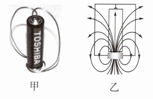 首先,我们需要根据图乙来确定磁铁的极性。在磁体外部,磁感线总是从$N$极发出,回到$S$极。由图乙可知,磁感线是从图下端发出的,因此,磁铁的下端为$N$极,上端为$S$极。