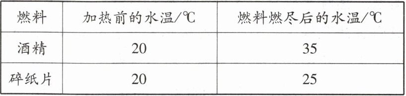 (3)由表格数据可知,用酒精和碎纸片分别加热质量相等、初温均为$20^{\circ}C$的水,燃料燃尽后,用酒精加热的水温度升高了$35^{\circ}C - 20^{\circ}C = 15^{\circ}C$,用碎纸片加热的水温度升高了$25^{\circ}C - 20^{\circ}C = 5^{\circ}C$,即用酒精加热的水升高的温度高,说明酒精放出的热量多,由$Q = mq$可知,在燃料质量相同时,放出热量多的燃料热值大,所以$q_{酒精}>q_{碎纸片}$。