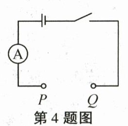 4. 如图所示,电路图由电流和PQ部分组成,电源电压恒定不变。两个定值电阻阻值分别为$ R_1 和 R_2 $,且$ R_1 大于 R_2 $,下列A、B、C、D四种不同接法分别接在电路图中的PQ两端。当开关闭合后电流表示数最大的是(