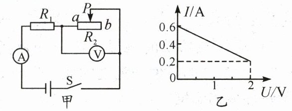 由图甲可知,定值电阻$R_1$与滑动变阻器$R_2$串联,电流表测量电路中的电流,电压表测量滑动变阻器$R_2$两端的电压。