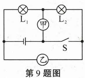 9. 如图所示,若开关S闭合后,灯$ L_1 $、$ L_2 $都能发光,则甲是