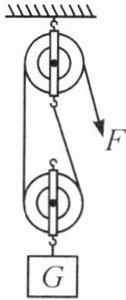 2. 在小型建筑工地,常用简易的起重设备竖直吊运建筑材料,其工作原理相当于如图所示的滑轮组,某次将质量为400 kg的砖块匀速吊运到高为10 m的楼上,用时40 s,卷扬机提供的拉力F为2500 N。g取10 N/kg,求在此过程中: