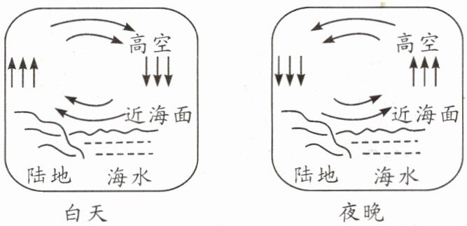 2. 炎炎夏日,小梅来到美丽的海滨城市青岛。她发现,在这里白天的风常常从海面吹向陆地,而每到夜晚,风却从陆地吹向海面。她利用学过的物理知识进行分析,并画出陆地和海面之间空气流动情况的示意图,如图所示。形成这一现象的主要原因是 (