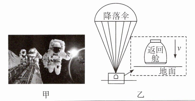 ;图乙是神舟十七号航天员乘坐返回舱返回地面的示意图,当返回舱即将着陆时,返回舱底部的反推发动机向下