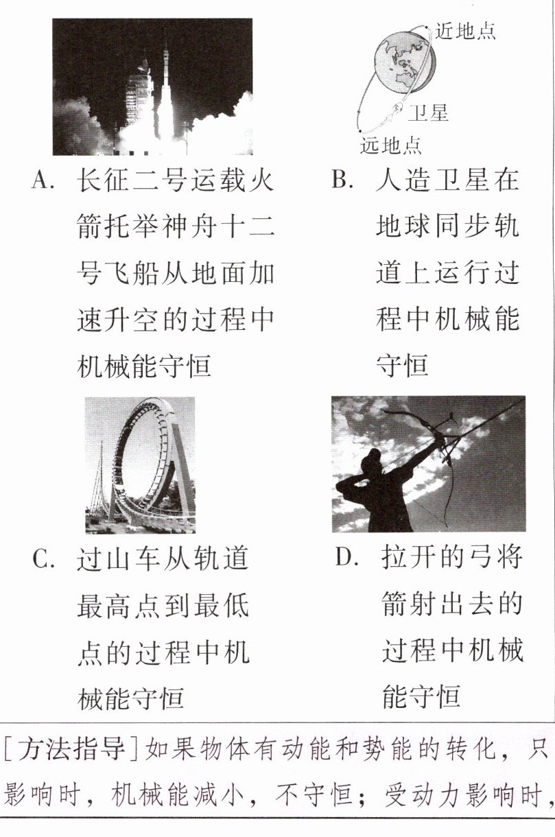 [方法指导]如果物体有动能和势能的转化,只有重力或弹力做功时,则机械能守恒;受阻力影响时,机械能减小,不守恒;受动力影响时,机械能增大,不守恒。